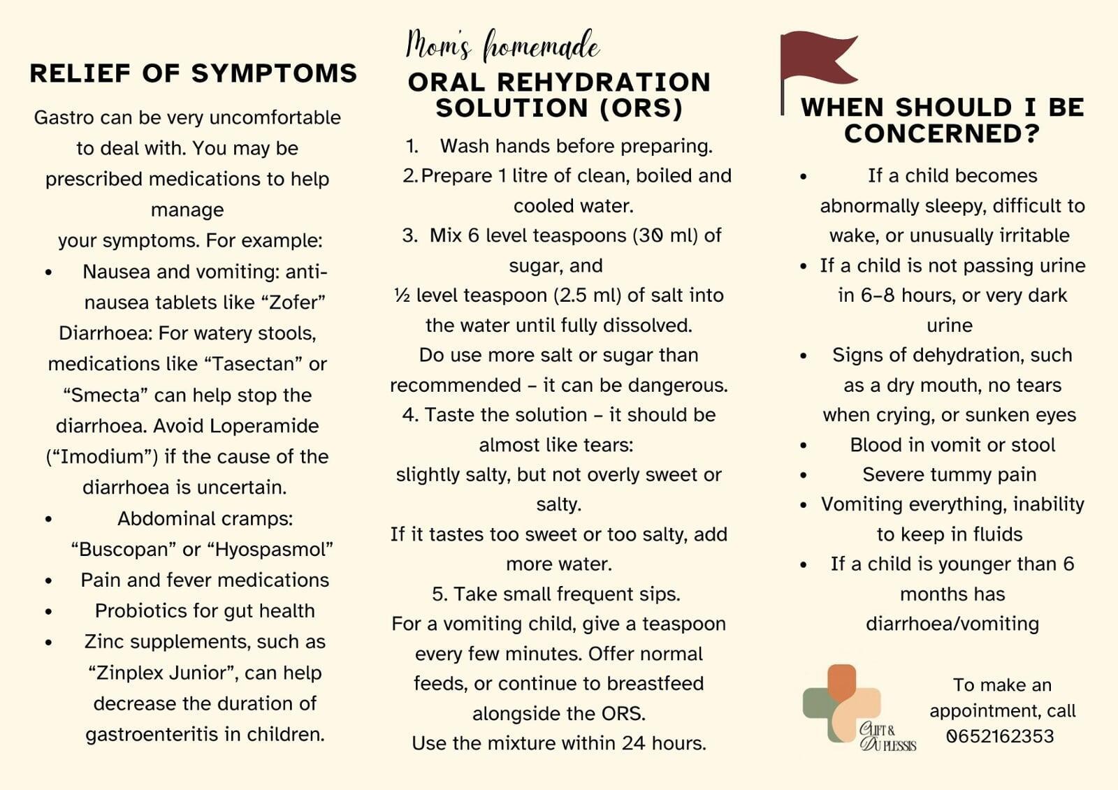 Below is our simple visual guide to help you navigate gastro with confidence, including how to prepare a balanced and safe oral rehydration solution at home, and what warning signs to watch for. If you're unsure or worried - give us a call and make an appointment!